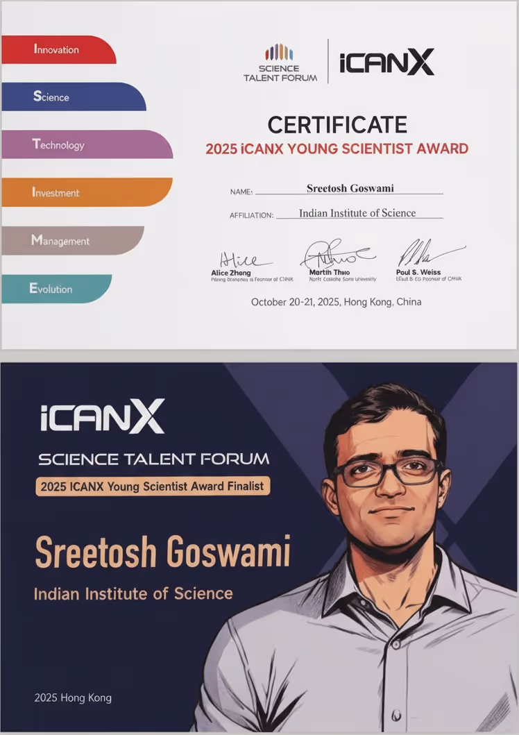 Prof. Sreetosh Goswami, has been awarded the prestigious 2025 iCANX Young Scientist Award at the iCANX Science Talent Forum in Hong Kong.